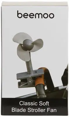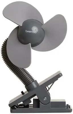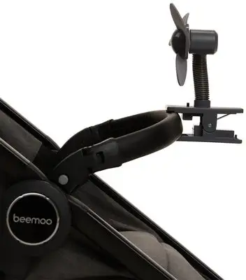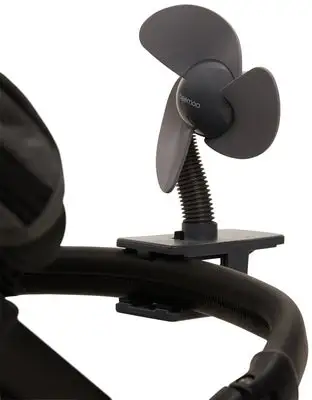 Universell, roterbar, grå Soft Blade barnevognvifte fra Beemoo i ABS med et blad med en stoppfunksjon. Den har et enkelt universalfeste. – Batterier er ikke inkludert