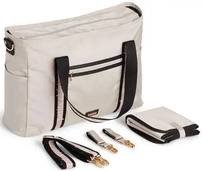En stilig stelleveske i et begrenset opplag, fra Petite Chérie. Stellevesken er utstyrt med flere forskjellige rom og sorteringsalternativer. Dette gjør at du enkelt kan holde oversikt, samtidig som du har plass til alt du trenger for utflukten eller trilleturen.Skulderstroppen er ekstra lang, slik at man kan bære vesken over brystet. De medfølgende barnevognhengerne er beregnet til søskenbarnevogner. En stellematte er også inkludert.