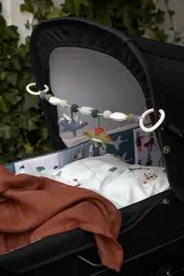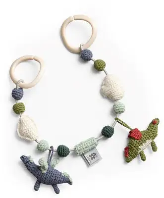 Søtt barnevognsanheng fra Sebra med heklede drager i bomull. Det har praktiske klipser i plast for enkel montering. – Anbefalt alder: fra nyfødt til 3 år. – bomull, PP-plast.