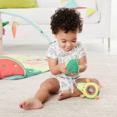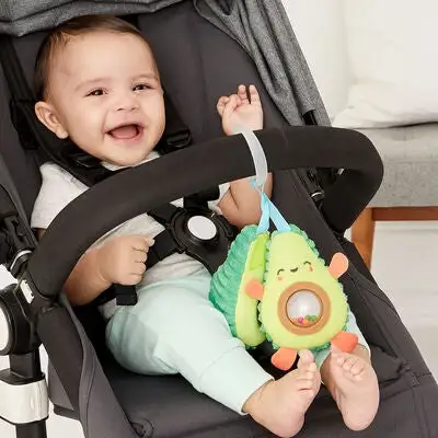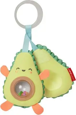 En herlig barnevognleke fra Skip Hop. Leken kan enkelt festes på barnevognens bygel eller på babybilstolen, og underholder barnet ditt på gåturen. De to avokadohalvdelene har en borrelås som er lett å åpne og lukke for småhender. Inne i avokadoen finnes det en rangle med fargerike kuler. Tilvirket i plysj med fine detaljer i flid. – REACH-testet inneholder ingen farlige kjemikalier Anbefalt alder: Fra 0 måneder.