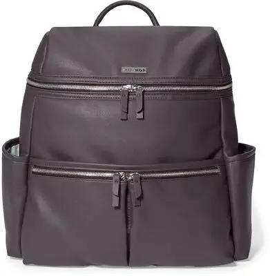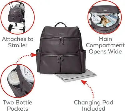 En stilren ryggsekk fra Skip Hop, laget i en moderne design med mykt kunstlær. Ryggsekken har 9 smarte lommer totalt, med blant annet to isolerende flaskelommer og tre glidelåslommer på utsiden. Justerbare og vatterte skulderreimer, gjør sekken god og komfortabel å bære på ryggen. Med et stort og lettilgjengelig hovedrom, er det dessuten raskt og enkelt å pakke sammen tingene og gå! Til ryggsekken, får du i tillegg med et praktisk stelleteppe.